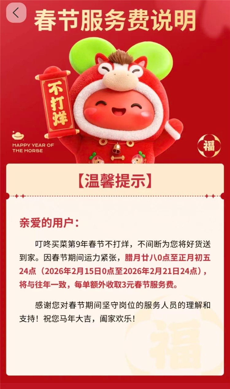 叮咚买菜延续往年做法,于2月15日至2月21日(腊月廿八至正月初五),在原运费基础上每单加收3元春节服务费。