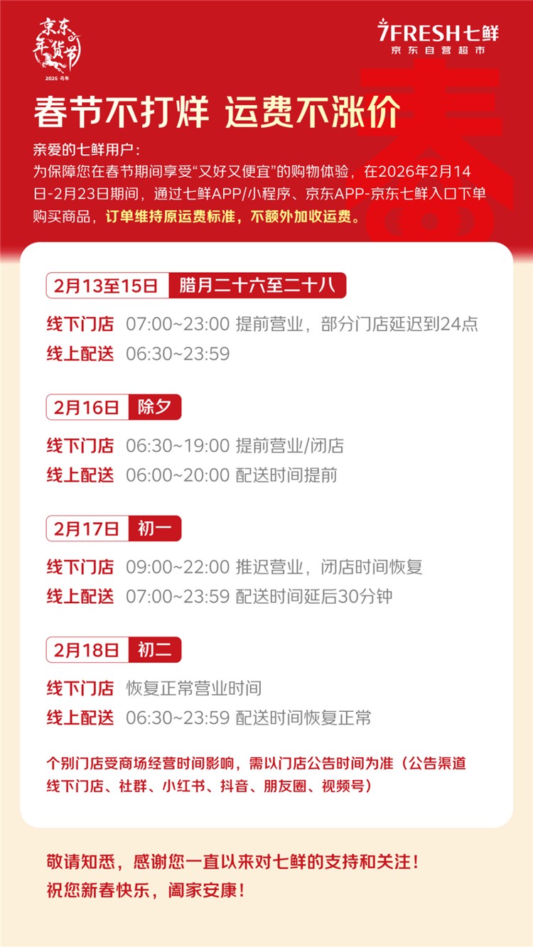与“放假”形成鲜明对比,京东七鲜今年选择用“坚守”回应春节消费需求。公司宣布,春节期间运费不涨价,该政策已连续执行六年。京东七鲜承诺,节日期间消费者仍能享受“又好又便宜”的购物体验。不仅如此,平台还承担了全部骑手的春节额外补贴费用,不将成本转嫁给消费者。同时,其“24小时菜”“24小时蛋”等特色鲜品将持续供应,保障市民春节餐桌常保新鲜。