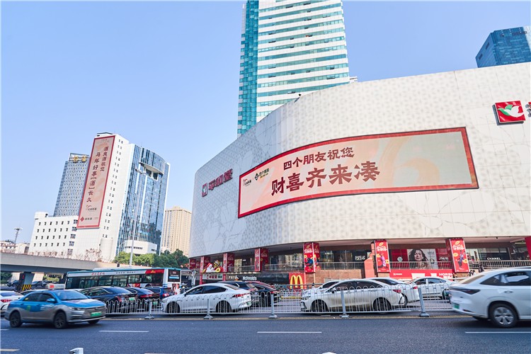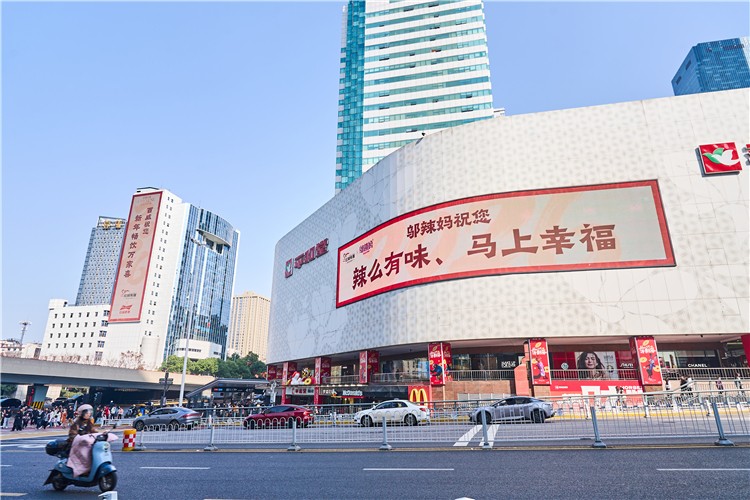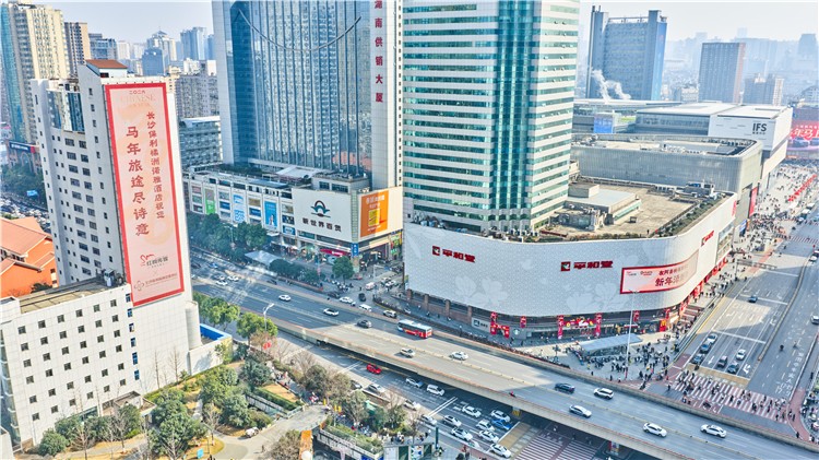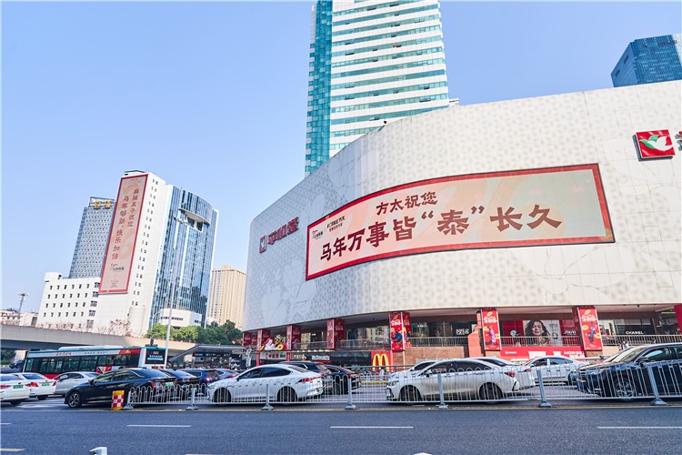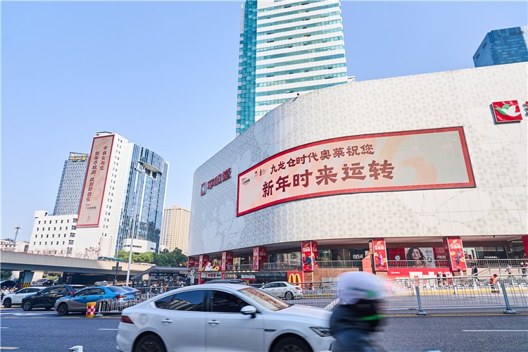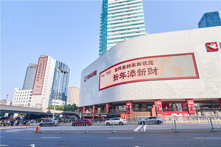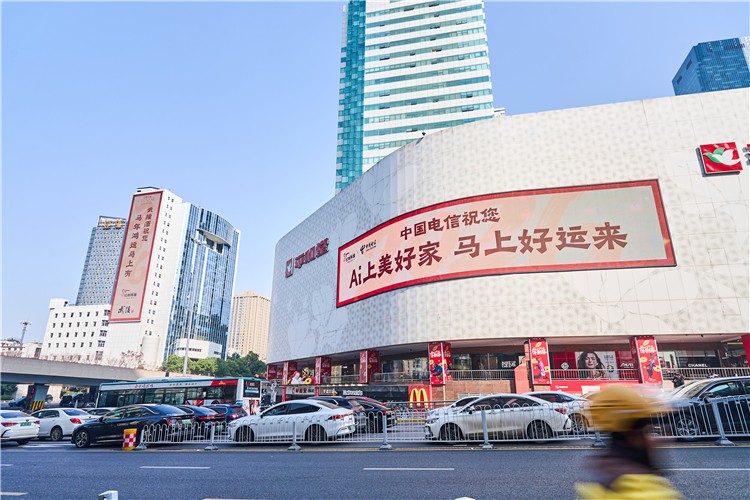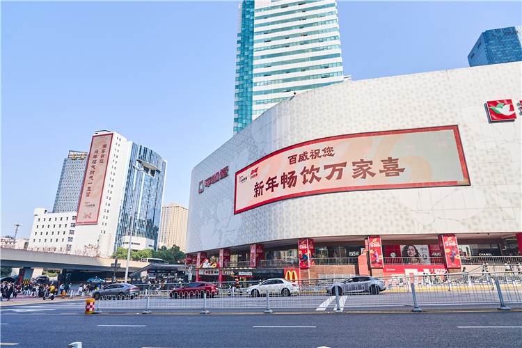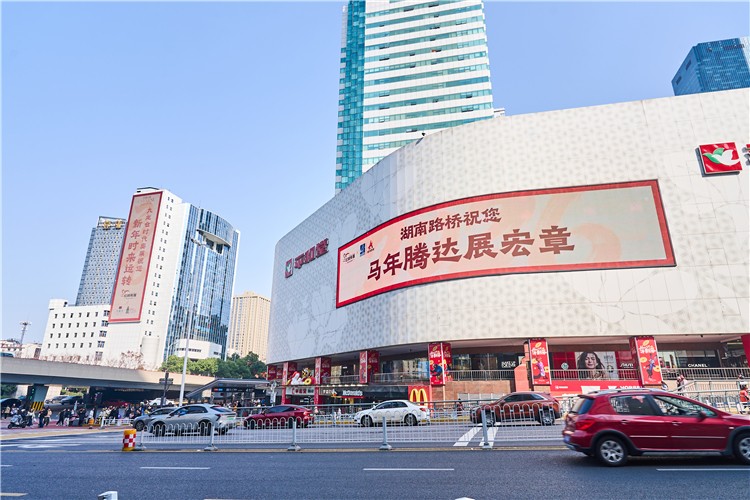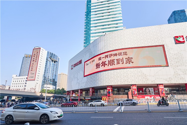 春节期间,长沙五一商圈内,银监局大楼与平和堂百货的两块巨型LED屏幕,正滚动播放着一场特殊的“视觉联欢”。鸣鸣很忙、元气森林、统一阿萨姆、汤达人、酒鬼酒、湘窖、红星实业集团、绿叶水果、麻辣王子、四个朋友、方太、九芝堂、长沙保利橘洲诺雅酒店、中国电信等20多家知名品牌、企业携手,以创意十足的动态祝福画面,向全体市民拜年,让城市公共空间洋溢着浓厚且新颖的新春暖意。