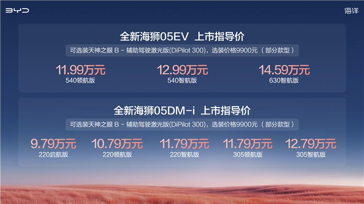 全新海狮05EV搭载第二代刀片电池及最新闪充技术,提供CLTC纯电续航540km和630km两个版本,具备“5分钟充好,9分钟充饱”的快速补能能力,有效缓解续航与充电焦虑。海狮05DM-i则提供220km和305km两种纯电续航版本,满油满电综合续航最高达2105km,百公里亏电油耗低至3.1L,实现“通勤可纯电,远行亦从容”。