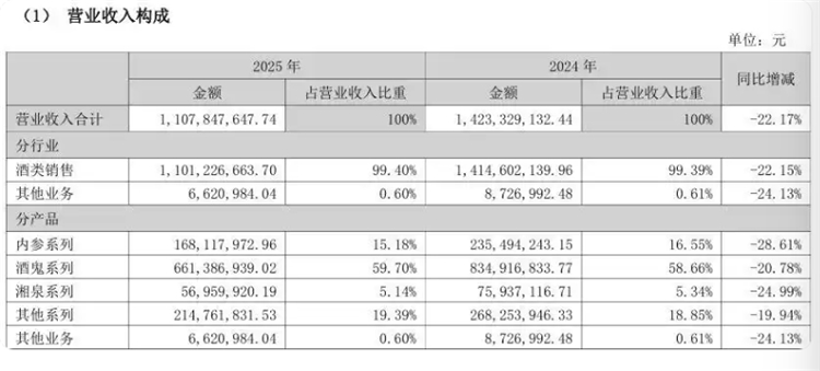 然而,正是这一数据的公布,也暴露出酒鬼酒内参系列销售滞销明显以及酒鬼系列其他产品营收持续大幅下降两大经营问题。年报显示,酒鬼酒2025年酒类销售收入为11.01亿元,同比下滑22.15%,内参系列和湘泉系列产品销售收入同比下滑28.61%和24.99%,下滑幅度相对较大。