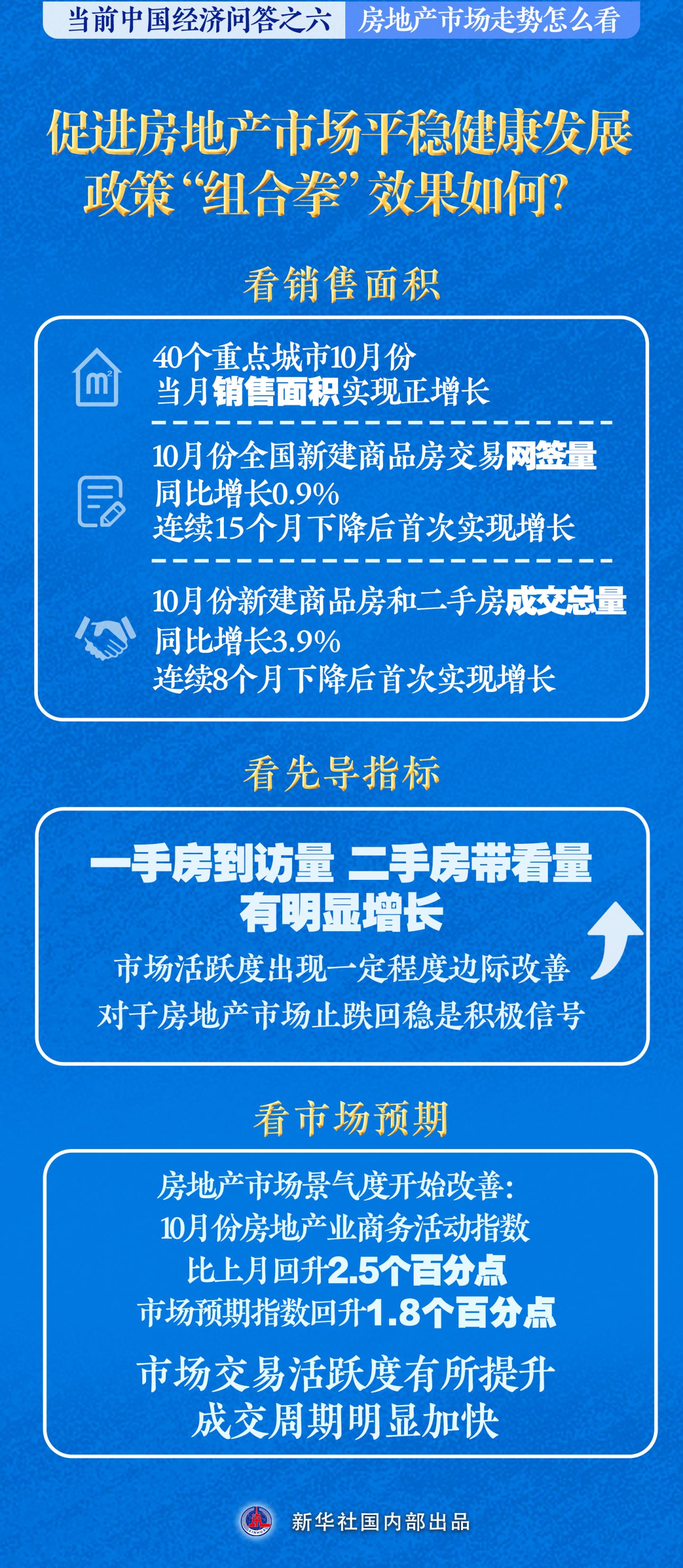 “总的来看,一揽子促进房地产市场止跌回稳的措施显效,10月份房地产市场出现积极变化。随着各项政策效能进一步释放,推动房地产市场止跌回稳的动能将增强。”