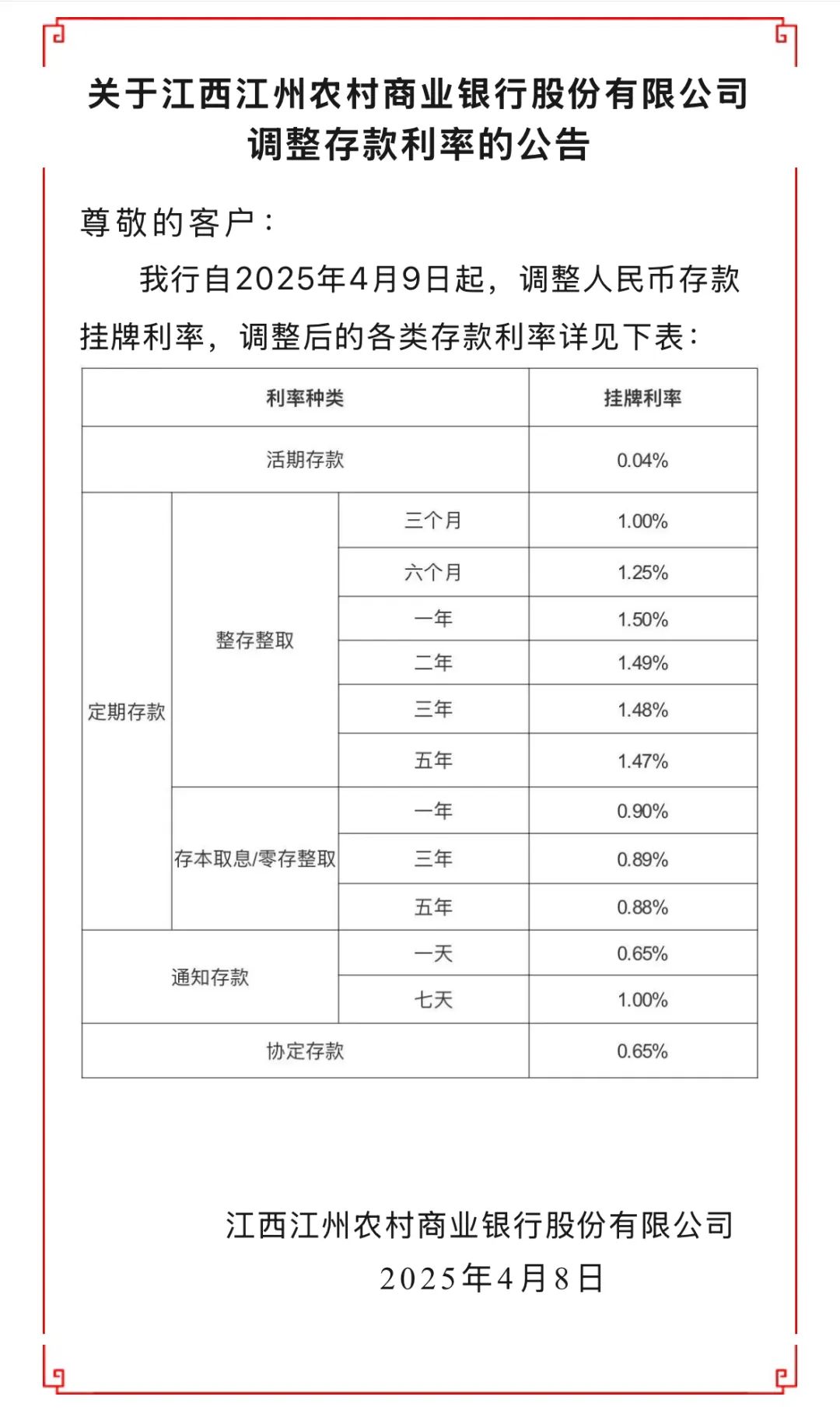 仅今年4月,江西江州农商行已先后两次调整了该行人民币存款挂牌利率。根据4月8日江西江州农商行发布的最新公告,自4月9日起,该行1年期、2年期、3年期、5年期定存挂牌利率分别降至1.50%、1.49%、1.48%、1.47%。其中,该行5年期存款利率较4月1日(上次调整日)下降38个基点。