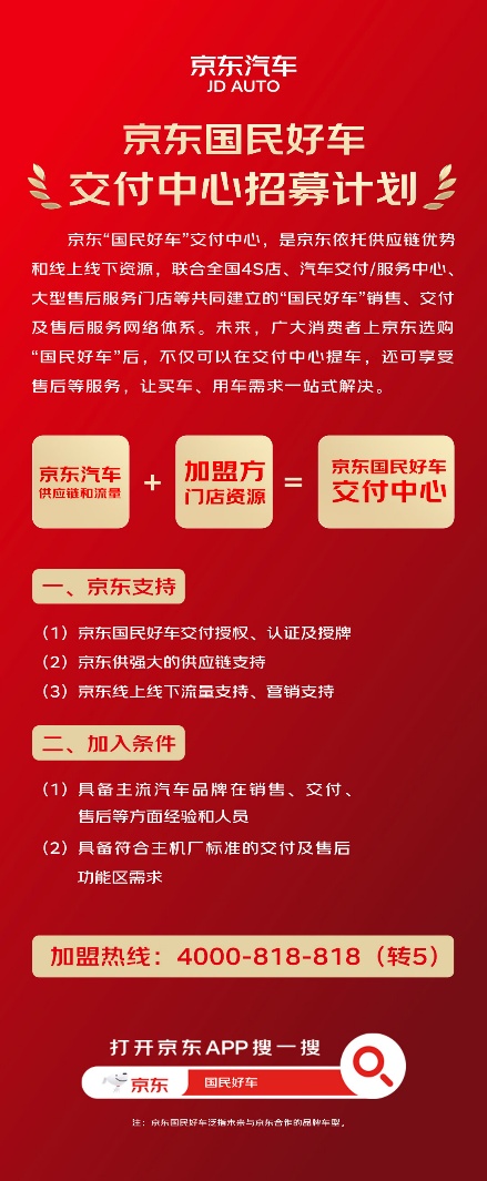 “国民好车”是京东汽车联合主机厂、电池厂商等产业伙伴打造的系列化高品质车型。其中,京东主要提供用户消费洞察与独家销售服务,不直接涉及制造环节。京东汽车发起“国民好车”交付中心招募计划,将整合资源携手行业伙伴推进服务网络落地,并助力传统4S店、经销商等向“多品牌”店转型。