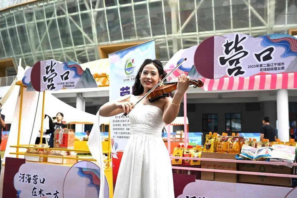“辽超”场地旁,“辽超市集”营口摊位进行节目演出