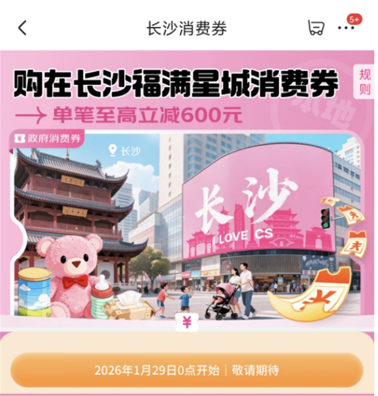 活动时间为2026年1月29日至2月14日,每日10时至23时59分。仅限定位在长沙且已完成实名认证的用户参与。用户可在抖音搜索“长沙消费券”,活动开始后即可领取,领完即止。