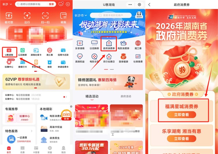 第三阶段消费券发放时间为2026年1月29日至2月14日,每日上午10时开始。用户可登录云闪付APP,点击“U惠湖南”,进入“政府消费券”专区,选择“福满星城消费券”领取。