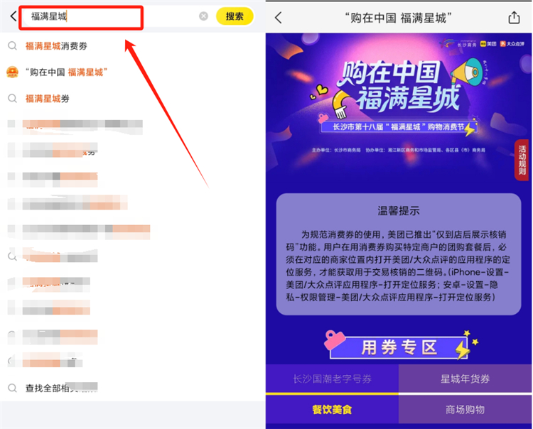 活动仅限实时定位在长沙市的用户参与。消费券分为商场星城年货券、小象星城年货券、长沙国潮老字号券三类,设有多档满减额度。同一用户每轮领取规则存在差异,部分券种可领取多张,部分仅限一张。用户可在美团或大众点评APP搜索“福满星城消费券”进入活动页面,数量有限,先到先得。